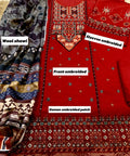 Experience elegance with this premium 3-piece embroidered suit crafted from high-quality Air-Jet Dhanak fabric. The front flaunts intricate full embroidery, complemented by heavily embroidered shoulders and sleeves for a sophisticated look. The back and trousers remain plain, balancing the design with understated elegance. Completing the ensemble is a digitally printed soft pashmina wool shawl, adding comfort and a luxurious touch. Perfect for formal occasions, this suit offers both style and refinement with guaranteed Dhanak quality.